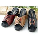 気品あるカメリアを、カジュアルな木目調ウエッジに乗せて。ブラックに映えるシルバー配色で、脱いだときも華やか!