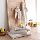 端のフリンジがどこか可愛らしい。伝統的でさわやかな生地にはっきりした色を2色組み合わせて作られたタッターソールチェック柄デザインの平織り今治タオル。