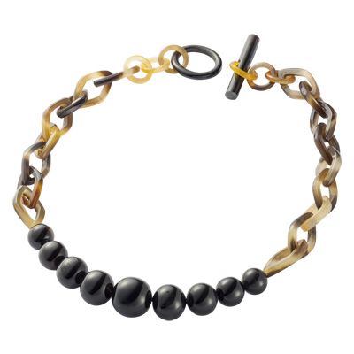 しっとりとした質感と微妙に感じられる透明感とが美しいウォーターバッファローの角を、大胆にデザインしたネックレスは、その見た目に反しとても軽い付け心地が魅力なネックレスです。