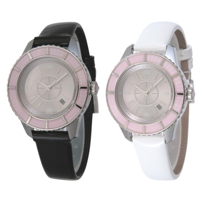 ベゼルのピンクサファイアクリスタルの存在感に白・黒の替えストラップで自由に雰囲気を変えることができます。