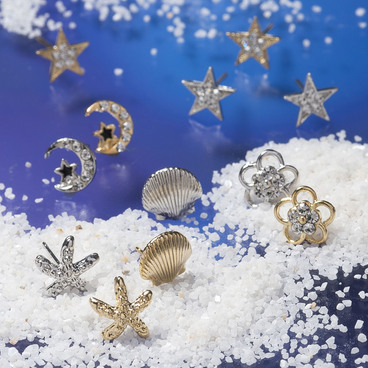 星、月、花、貝殻、ヒトデ柄と集めても楽しめるモチーフピアスです。お好みでゴールド、シルバー選んでください。
