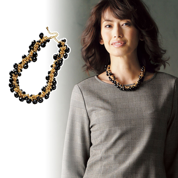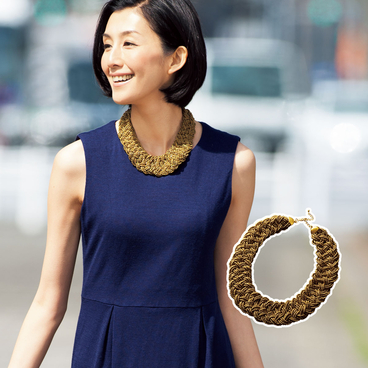 艶をおさえたアンティークゴールドがシックな表情。複雑に編み込んだビーズの存在感がデコルテに華やぎをもたらします。