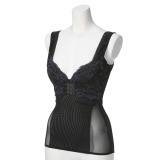 ベースに吸水速乾性のあるストレッチ素材を使用し、前身頃にストレッチレース生地を重ねた、カップ付きキャミソールのご紹介です。