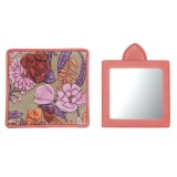 革を京友禅の技法で染色し、蒸して立体柄に仕上げた素材を使用しています。ミラーにはツマミが付いており、ケースから取り出しやすいつくり。