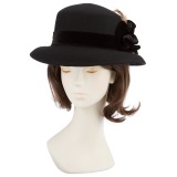 クラシカルな雰囲気が素敵な印象のフェルトハットです。べロアリボンを花のようにデザインし、フェザーモティーフをほどこしました。