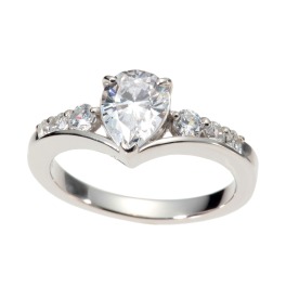 大ぶりのペアシェイプのジアモンドを配し、両サイドにラウンドブリリアントカットのジアモンドをあしらったリングです。