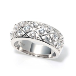 高品質のCZであるジアモンドをふんだんにあしらった、繊細なレースデザインが目を惹くリングです。高度な加工技術を駆使した地金のレースデザインとジアモンドの輝きのコラボレーションをお楽しみください。