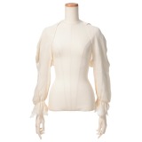 極上の絹のような柔らかさが魅力のレッキスラビットファーを使用した、ニッティングマフラーです。オーガンジー素材にサテンをあしらった、フラワーモティーフのようなリボンがアクセント。