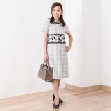 フリンジテープをほどこしたワンピースです。生地はツイード調のジャガード素材を使用。襟ぐり、前身頃のハイウエスト切り替え部分にフリンジテープを使い、動きのあるデザインに仕上げました。