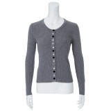 リブ編みですっきりと仕上げたクルーネックカーディガンです。前立てに配された大小のボタンがデザインのポイント。