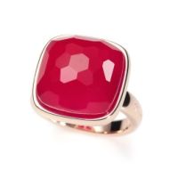 ローズゴールドカラーの地金に、クッションカットのレッドカルセドニー(着色あり)をあしらったリングです。