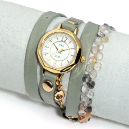 清涼感のある色味のクォーツァイトと幾重にも連ねたチェーンがおしゃれな、ラウンドフェイスのレザーラップベルトウォッチです。
