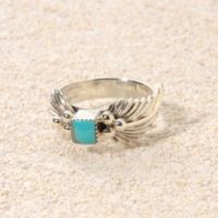 ネイティブ アメリカン キングマン産ターコイズ スクエアカボション リーフモティーフリング<ナバホ族