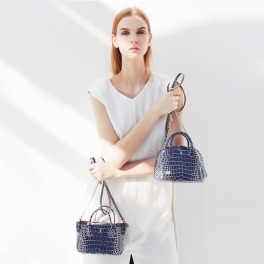 ■外側: 一見デニムに見える、当ブランドで人気のデニム調ピッグレザーを用いた、カジュアルからエレガントまで幅広いコーディネイトに使えるアイテム。