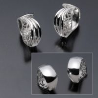 地金にシルバーを使用し、透かしをほどこしたボタニカルデザインの面と、シンプルな鏡面のリバーシブルでお使いいただける“ミミソフト”です。
