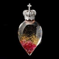 ラウンドとスクエアカットのルビー計3カラットUPを、シリコンオイルや金色の樹脂ラメとともにガラス瓶の中に封じ込めたペンダントトップです。