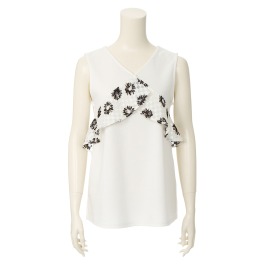 胸元部分にオパール加工をほどこしたプリント素材で大胆なフリルをあしらったプルオーバーです。身生地にはストレッチ性のある柔らかいカットソー生地を使用しているので快適な着心地。