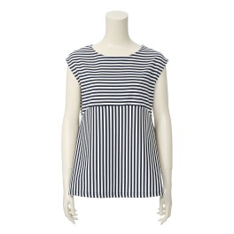 ボーダー柄とストライプ柄で切り替えたペプラムラインが目を惹くプルオーバーです。後ろ身頃の切り替え部分に無地の異素材を組み合わせたデザインが甘い雰囲気を演出。