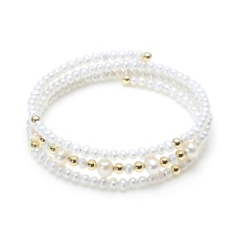 幅2.5mmUPのベビー淡水パールをメインに連ね、ゴールドカラーのボールパーツと幅4.5mmUPの淡水バロックパールを組み合わせた3連のワイヤーブレスレットです。