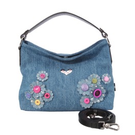 ■外側:日本製のデニム生地に洗い加工をほどこした、程良いヴィンテージ風の味わいのある素材を使用。前面にほどこした同素材のフラワーモティーフに、デザインのアクセントとして、花芯に見立てたカラフルなボタ…