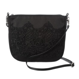 ■外側: 前面は光沢感のある生地にローズモティーフのギュピールレースをほどこした、ゴージャスなデザイン。