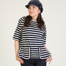 マダムミーナボーダーポケットアクセント六分袖プルオーバー