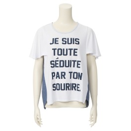 製品に仕立てたあと、前身頃にプリントをほどこして仕上げたプルオーバーです。プリントと同系色のグログランリボンを後ろ襟部分に配した、おしゃれなデザイン。