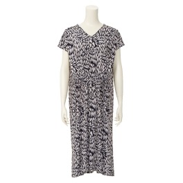 変形ハート柄プリントがほどこされたワンピースです。前身頃ウエスト部分に配したひもによりギャザーを調整することができるので、お好みのフォルムで着用していただけます。
