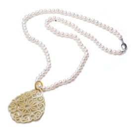 フィリグリーデザインの透かし柄をほどこした水牛素材のトップと、淡水バロックパールのネックレスを組み合わせたロングペンダントです。