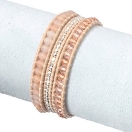 チャン・ルークォーツ&クリスタルガラスファセットビーズピーチカラーミックスレザーラップブレスレット
