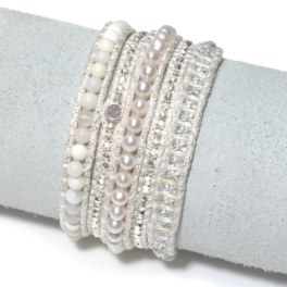 オパールのラウンドビーズに、シェルとスワロフスキー社製クリスタルガラスのファセットビーズをミックスし、全体をホワイトカラーに仕上げたレザーラップブレスレットです。