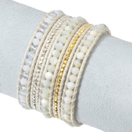 チャン・ルーオパール&シェル&クリスタルガラスホワイトカラーミックスマルチストランドレザーラップブレ