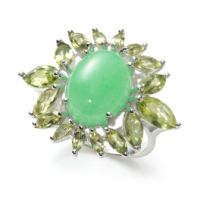 オーバルカボションの本翡翠をセンターに配し、マーキースシェイプのペリドットで囲んだ、フラワーブーケモティーフのリングです。