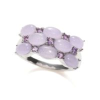 横向きのオーバルカボションのラベンダー本翡翠とアメシストを交互に配し、3本のラインを描いた、クラシカルでありながらトレンド感も併せ持つリングです。