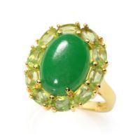 ボリューム感のあるオーバルカボションの本翡翠をセンターに1石配し、その周りをオーバルシェイプのペリドットで囲んだリングです。
