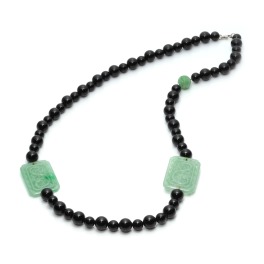 ドラゴンのカービングをほどこした本翡翠と、ブラックオニキスのビーズをメインに組み合わせた、存在感抜群のロングネックレスです。