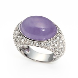 大ぶりのラベンダー本翡翠をセンターに配し、アームにホワイトトパーズをあしらった存在感抜群のボリュームリングです。