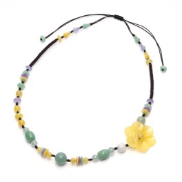 イエロー、グリーン、ホワイト、ラベンダーカラーの計4色の本翡翠のさまざまなシェイプのビーズをあしらい、フラワーデザインのイエロー本翡翠をポイントに配した、可憐な雰囲気のコードロングネックレスです。