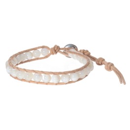 シェルのラウンドビーズをあしらったレザーブレスレットです。■本体:シェルのラウンドビーズを連ね、牛革のコードと組み合わせたブレスレット。