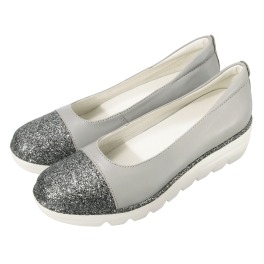 ■外側:柔らかな牛革をベースに使用した、足になじみやすい仕上がり。つま先とソール周りにグリッター素材をあしらうことで、デザインのアクセントにしました。