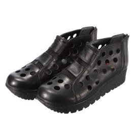 ■外側: 格子状に三角形の抜きカットをほどこした、山羊革を使用。2種類のメタリック調のスタッズがデザインのポイントです。コンフォート性とファッション性を兼ね備えた一足。 ■内側: ライニングは牛革を使用。 ■ソール: 当ブランドの創業者であるマルシア・キルゴア氏と、英国ロンドンサウスバング大学の生体工学博士チームが人間工学に基づき開発した、国内特許を取得している“マイクロウォブルボード”を使用。従来のアイテムに見られるような横に層を作る方法ではなく、縦に分けた3つの層を、それぞれ密度を変えて仕…