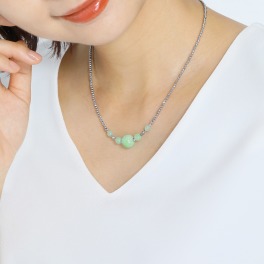 胸元に無着色本翡翠(無色透明剤の含浸処理あり)のラウンドビーズをアクセントであしらい、シルバーカラーのファセットビーズ(模造石)を繋げたネックレスです。