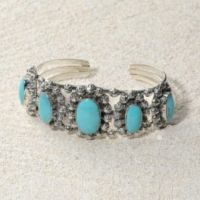 オーバルカボションのキングマン産ターコイズを4石使用したバングルです。 ナバホ族が得意とする“スタンプワーク”と呼ばれる技法を用いて作製しました。