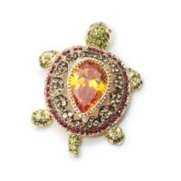 さまざまな色合いのビジュウをあしらった、カメモティーフのブローチです。 イエローの大ぶりのペアシェイプのビジュウをあしらった甲羅が目を惹くアイテム。