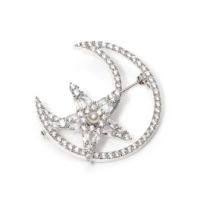 マダムヒロコCZ&パールビジュウムーン&スターモティーフブローチ“星を抱く月”