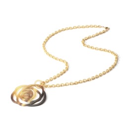 水牛素材を切り抜いたローズモティーフのトップに、ゴールドカラーのチェーンネックレスを組み合わせた、ロングペンダントです。