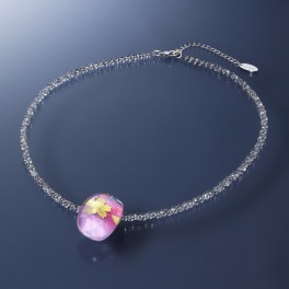 色とりどりのガラスや金箔(22K)、銀箔を閉じ込めたガラスのトップに、ビーズネックレスを組み合わせた、桜モティーフのペンダントです。
