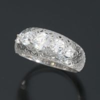スワロフスキージェムスが認定したカット工場で、当取引先が“グリッターカット”と呼んでいるハンドカットをほどこした大粒のCZ1石と、ラウンドカットCZ2石をあしらったスリーストーンリングです。