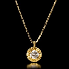 地金に24K(チェーンは18K)を使い、カラーグレードの最高峰“Dカラー”に分類される無色のダイヤモンドを1石あしらったネックレスです。