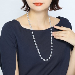 長崎県対馬産の幅7?9mmUPの無調色ナチュラルブルーシルバーアコヤバロックパールを連ね、その間に無調色ナチュラルブルーシルバーアコヤケシパールと18Kホワイトゴールドのミラーボールを挟み込んだロング…